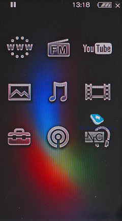 С управлением все великолепно, сплошной восторг. Сделано для людей, никакой путаницы, все удобно, вот здесь перед нами старая добрая Sony – множество кнопочек, которые облегчают жизнь. МенюПоговорим про меню и основные функции плеера. В режиме ожидания на дисплее находятся девять иконок, есть запас для еще по крайней мере одного ряда. Возможно, это некий задел на будущее, с новыми прошивками новые функции будут добавляться. Хотя верится в это с трудом, не думаю, что X-1050 повторит славный путь Samsung YP-P2. Я говорю о том, что для P2 было выпущено более десятка прошивок, причем многие из них добавляли новые функции, программы, начиная от игр, заканчивая приложением для просмотра карты метрополитена. В верхней части экрана находится индикатор воспроизведения, он поможет вам понять, проигрывается ли сейчас какая-либо песня или стоит на паузе. Правее - часы, рядом с ними - индикатор заряда аккумулятора, еще правее - индикатор работы Wi-Fi. Описанные индикаторы видны в любой точке меню, то есть вы всегда можете быстро узнать время, заряд батареи и так далее. Это удобно. Вот только жаль, что нет всяких характерных для Sony излишеств, какой-нибудь заставки с отображением названия песни, какой-нибудь забавной анимации или еще чего-нибудь. Мало того, в режиме ожидания вполне можно было бы сделать нечто вроде бегущей строки с информацией о композиции, которая играет в данный момент. Увы, все строго, минимум каких-либо интересных "бонусов". Теперь я предлагаю пройтись по пунктам меню и разобраться, что умеет X-1050. Начнем с плохого и потихоньку перейдем к хорошему.