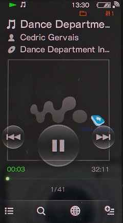 Музыкальный плеерПожалуй, самая важная часть X-1050. Как говорится, старого пса не научишь новым трюкам, - любой Walkman славен прежде всего музыкальными возможностями, но никак не дополнительными функциями (я про браузер в первую очередь). Итак, когда вы открываете плеер, перед вами появляется обложка, картинка большая, вовсе не миниатюрная миниатюра, как в плеерах серии A. Над обложкой - названия композиции, исполнителя, альбома. Под ней - индикатор времени воспроизведения, можно кончиком пальца перематывать ползунок к нужной секунде или минуте. Это особенно удобно, если вы слушаете длинные композиции, аудиокниги. К сожалению, с помощью кнопок так же быстро перемотать не получится, происходит это медленно, при постановке на паузу перемотка становится быстрой, но не прогрессивной. Мне кажется, давно бы уже можно было перенять опыт других производителей, когда при нажатии на кнопку перемотки с каждой секундой скорость увеличивается.