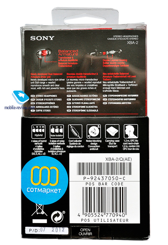 Упаковка и комплектацияПодарочная упаковка красива, но я ругаю её уже в третий раз (и буду делать это снова и снова). Да, мне уже писали, что её легко раскрыть и закрыть, может быть, это и так – но давайте будем реалистами. Есть гораздо более удобные упаковки, например, у Westone. Короче говоря, если консультанты в магазине откажутся распаковывать для вас эти наушники, не думайте, что они (консультанты) такие плохие. ![]() ![]() ![]() С другой стороны, с комплектом всё опять замечательно. Чехол для переноски – удобно, каркас для намотки провода – тоже плюс, куча насадок – великолепно. ![]() Слева – «шумоизолирующая» насадка, а справа - «гибридная» Внешний вид и удобство эксплуатацииКорпуса наушников выполнены из пластика, дизайн интересный – комбинация титанового и серебристого цветов. Классная сборка, придраться не к чему. ![]() ![]() Из «фишек» линейки XBA здесь есть всё – и выдавленная точка на кембрике левого наушника, и красное кольцо на кембрике правого, и красная буква R – всё как полагается. Кабель асимметричный, лапшевидный, штекер «Г»-образный, средних размеров. ![]() Звуководы выходят из корпуса прямо, посадка наушников удобна как проводом вниз, так и проводом вверх. Шумоизоляция очень хорошая, особенно с шумоизолирующими насадками (внутри них – вспененный материал). Можно спокойно ездить в метро. Наушники отлично фиксируются в ушах, с этим нет проблем. ![]() ![]() ![]() ![]() ЗвукНаушники тестировались с плеерами Hifiman HM-801 (с усилителем Game Card) и iBasso DX100. Использовался тестовый диск Prime Test CD1. Арматурные наушники с двумя излучателями – это либо сдвоенные одинаковые «арматуры», либо комбинация из НЧ и СЧ-ВЧ излучателей. В случае XBA-2 это именно связка двух разных излучателей, из описания компании вообще следует, что это XBA-1 с НЧ-излучателем. И, в общем-то, в результате прослушивания я скорее согласен с подобной постановкой – здесь хорошие НЧ, нормальные СЧ и слабые ВЧ. И если в случае XBA-1 за 1.5 тысячи рублей требовать чего-то большего как минимум кощунственно, то за 5-7 тысяч рублей, которые хотят за XBA-2, хочется получить гораздо более детальный звук на высоких частотах. Но давайте по порядку. Низкие частоты – хорошие, с претензией на глубину, упругие и детальные. А если не вдаваться в «аудифильские» дебри, то инструменты с НЧ-составляющей – будь то бочки или гитары – различимы хорошо, гула практически нет, XBA-2 «тянут» гораздо больше инструментов, чем XBA-1. Дополнительный излучатель здесь к месту. Средние частоты мне очень сильно напомнили XBA-1, но на фоне хороших НЧ они несколько проседают и кажутся не такими «живыми», как это могло бы быть. Высокие частоты откровенно придушены, здесь нет прозрачности. СовместимостьС Apple iPhone 4 наушники сыгрались хорошо, есть некие нарекания по воспроизведению НЧ и ВЧ – бОльшие, чем в случае комбинации XBA-2 с Hifiman HM-801, но ничего серьёзного. Запас по громкости хороший. ![]() КонкурентыЗа 5-7 тысяч я бы, честно говоря, смотрел на другие модели – Creative Aurvana In-Ear 3, Audio-Technica ATH-CK70, да и даже на старшую модель XBA-3, минимальная цена на неё – как раз 7 тысяч рублей. ВыводSony XBA-2 – откровенно странная модель. Если XBA-1 и XBA-3 своих денег стоят, то XBA-2 – увы, нет. Мне кажется, что адекватная цена на XBA-2 – тысячи 3, ну максимум 4. За дополнительный НЧ-излучатель доплачивать 3-4 тысячи рублей, как я считаю, не стоит. Эргономика, дизайн, комплектация – всё то же самое есть и у XB
