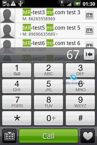 Review of Android 1.5 OS. Phone functionality.Table of contents:I decided to chop our review of Android 1.5 OS into several installments, each of which will focus on specific features of the system. First off, let's take a look at its phone functionality and everything related: phonebook, data synchronization, calls, profiles and so on. All articles are based on the operating system found in the HTC Hero, so occasionally you'll find remarks about some feat being device-specific or HTC's own invention, so it might be unavailable in other phones powered by this OS. Dialing numbersThe phone's display automatically turns off and can be brought back to life by pressing any button on the casing, which will bring up the home screen. To unlock it, you'll need to sweep your finger from top to bottom or put it on the arch and move it down or tap the Menu key below the screen twice (first time to turn the screen on and then one more time to unlock the device). ![]() ![]() To start dialing a number, just press the Call key, situated beneath the display - doing so will bring up the number pad, allowing you to dial a number. However, these on-screen buttons house not only digits, but also letters, so that you'll be able to search for a contact in your phonebook. Similar setup is employed in Windows Mobile based devices, they call it "Smart Dial". Using this feature you can enter a contact's name without having to open the phonebook or leave the dial screen. The phone starts searching in stored phone numbers and contact names as soon as you begin typing. For example, if I enter "525", I'll get a list of contacts whose first or last name includes the letters assigned to 5, 2 and 5 (as in JKL+ABC+JKL). ![]() ![]() Beneath the numberpad are the minimize key, Call button and the heart-shaped Favorites shortcut. When dialing a number or receiving a call, you'll see the picture assigned to the relevant contact. ![]() ![]() Back to the table of contents >>> PhonebookAndroid arranges all entries in the form of a list, where contacts are accompanied by thumbnails of assigned pictures. The contact name field can show up to 24 symbols (including spaces). The of the most crucial drawback of the Android's phonebook setup is that you can't see contacts' phone numbers beneath names, nor does it allow you to reverse the position of first and last names in the list. ![]() Search in the phonebook is performed by first and last name. You can scroll through the contact list is you hold your finger in the right part of the screen, which will call up an alphabetical search filter. ![]() ![]() ![]() ![]() The only factor limiting the maximum number of contacts is the amount of free memory on your device. All entries feature the following basic fields: phone number, email address, ringtone, picture and aliases in social networks. Other fields are optional and include a variety of additional numbers (home, work, fax, etc), address (home, work) and handles in IM services (MS Live, Skype, QQ and so on). ![]() ![]() ![]() ![]() Sitting at the foot of the screen is a toolbar with a whole array of tabs, leading to Favorite contacts, Groups, Social Networks and Call log. ![]() ![]() ![]() The contact's window also offers a selection of tabs, including contact's details, message history, his messages in social networks, assigned images and individual call log. In a word, the user gets to check out all essential info on any entry in the phonebook without having to delve deep into other menus, such as the Call Log, Messaging and so on. Any entry may be transferred to another contact via a vCard. Back to the table of contents >>> GroupsAndroid enables the user to create any number of groups; contacts may be added into them simply by ticking required entries in the phonebook. The key feature of Android's contact groups is the ability to send messages and emails to all members of a specific group, which can come in handy. ![]() ![]() ![]() ![]() You can assign a separate picture to a group, but not a individual ringtone, which is a drawback, of course. Back to the table of contents >>> Call logUnfortunately, Android's Call Log is not the most convenient one we have seen. Various call types (incoming, outgoing, missed) are indicated by small thumbnails on the right, while all calls are arranged in a single list. Calls from one contact don't get merged into one entry, even if you received 10 calls from the same person in one day, same holds true for outgoing and missed calls. All in all, it's reasonably difficult to navigate through such a tangled list, although Android still allows the user to view incoming, outgoing and missed calls separately. ![]() ![]() Back to the table of contents >>> Missed callsIf the screen is locked, all information about missed calls may be found on the arch and the top-mounted status bar. When you unlock the phone, all info will still be available in the status bar, to access a more detailed view just hold it and drag it down. ![]() ![]() Sitting next to the missed call icon in the status bar is the number of calls you missed. Back to the table of contents >>> Home screenContacts may be tacked on the home screen, however HTC-branded devices offer a special widget, which allows for a different setup. The former way implies throwing a shortcut to a contact onto the home screen - whenever you tap it the phone will either dial a number or open the New Message window. Furthermore, you can opt to have shortcuts to multiple numbers that are assigned to a contact (home, work, mobile etc) and a separate icon for writing a text message or an email. In other words, as far as the maximum number of shortcuts available for a single contact, you're not limited by anything. The only shortcoming of this setup is that all shortcuts look alike, so the only way to distinguish between them is by their captions ("Call", "New Message" and so on). These shortcuts may be located on any of the five screens of the UI and in any order. ![