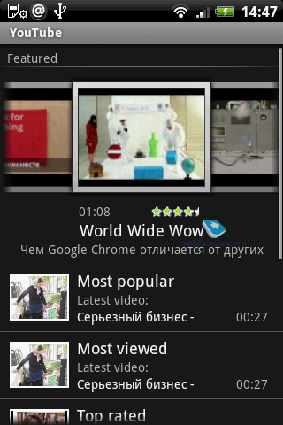 Обзор операционной системы Android 1.5. Мультимедиа-возможности системы с интерфейсом HTC SenseСодержание:В третьей части обзора Android 1.5 мы поговорим о мультимедийных возможностях системы. Однако сразу сделаю одну важную оговорку. Дело в том, что «сырая» ОС от Google и обозреваемая нами в этом материале – большая разница. Но если в предыдущих статьях большая часть функций – именно особенности ОС, и лишь часть – доработки HTC, то в плане мультимедиа ситуация обстоит ровно наоборот. Большинство описанных ниже виджетов принадлежат интерфейсу HTC Sense, и малая часть функций – собственно системе. Музыкальный проигрывательСтандартный системный проигрыватель для аудиофайлов и фирменный от HTC заметно отличаются, в стандартном есть только базовые функции, тогда как фирменный – почти точная копия аналогичной программы, предустанавливаемой в коммуникаторы HTC на WM. Основа этого проигрывателя – библиотека с разделением на исполнителей, альбомы, плей-листы, а также список из всех песен. ![]() ![]() ![]() ![]() Во время проигрывания в полноэкранном режиме отображается картинка альбома, оставшееся и пройденное время трека, а также название группы и трека. Из этого окна можно перейти к библиотеке или списку проигрываемых треков. Также есть возможность посмотреть свойства проигрываемого файла или установить его на звонок. При желании выбранный трек для звонка можно обрезать по длине. ![]() ![]() ![]() В случае если в списке проигрывания треки из разных альбомов или разных групп, в главном окне они отображаются горизонтальной строкой картинок альбомов, так что менять треки можно как кнопкой вперед-назад, так и пролистыванием картинки альбома вправо и влево. Эквалайзер в проигрывателе не предусмотрен. Для проигрывателя есть три виджета на рабочий стол, два от HTC и один стандартный. Виджеты от HTC отличаются только размером - один занимает весь экран, второй - только половину, в обоих виджетах отображается обложка альбома, а также полоса проигрывания и клавиши управления. Стандартный виджет проще: кнопками проигрывания/паузы, следующим треком и названием трека его возможности заканчиваются. ![]() ![]() ![]() ![]() Кроме виджетов на любой из экранов рабочего стола можно вынести значок проигрывателя, но, что удобнее и интереснее, - значок любого музыкального плей-листа. Таким образом, проигрывание того или иного плей-листа можно начать нажатием соответствующей иконки, не заходя в проигрыватель. ![]() Кроме отображения проигрывания на рабочем столе (если есть соответствующий виджет) эта информация показывается в информационной строке. ![]() Еще две приятных особенности проигрывателя: во-первых, ставить трек на паузу или менять его можно и в режиме блокировки, не разблокируя экран, а просто включив его. Во время проигрывания и в режиме блокировки на экране отображается обложка альбома, а также клавиши управления плеером. ![]() ![]() Во-вторых, изменять громкость музыки можно клавишей громкости, не включая экран аппарата, то есть «из кармана». Удобная возможность. Фото и видеоДля просмотра фотографий и видео используется одна и та же программа – Альбомы (в случае ОС без дополнений – Галерея). При входе в программу можно выбрать одну из трех вкладок: с фотографиями и видео, а также с содержимым facebook или flickr при наличии соответствующих учетных записей. Содержимое разбивается по папкам и отображ