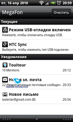 Synchronization with Google services is convenient because you can create events on PC or a laptop, edit them in the browser and all data are immediately updated on your smartphone. When you create an event in Google Calendar it appears in the phone within seconds. It also works for contacts. When they are edited on the server information is updated on the phone. HTC smartphones offer one more way of synchronization with the help of HTC Sync, which is installed on the PC. ![]() As a rule this software comes in the box on a memory card. If it is not included or is outdated you should ask HTC support for a new one. Unfortunately, I could not find the download page for this application on European and Russian websites of HTC while on the US site everything is easily available. For example, the version for HTC Hero. HTC Sync helps to synchronize the contacts and calendar between your smartphone and PC. You can synchronize with address books of Outlook Express or MS Office Outlook. You can do it manually or choose settings for the automatic synchronization. ![]() ![]() ![]() ![]() ![]() Apart from that, HTC Sync can install new software onto the smartphone in the form of .apk files. ![]() The application is simple, all features and settings are intuitive and can be easily customized. Surely, you cannot compare HTC Sync with such monsters as Nokia PC Suite (now Ovi Suite) or Samsung PC Studio, but it is not bad to have an application with basic synchronization features. Back to the table of contents >>> Messages, mail, text inputDisplay of new (missed) messagesWhen the screen is blocked new text messages are displayed in the lower part of the screen under the unlock arc and in the information line above as an icon. The field under the lock arc shows only text and multimedia messages, while mail messages are not visible here. ![]() Text messages in the information line are represented with an envelope icon, e-mails from Gmail have an icon resembling the logo of this mail client, other mail applications use a special envelope. When you launch the information line you see the number of new (unread) text messages and e-mails. To the right from each line you see the time when the last message of the type was received.