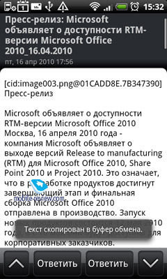 E-mail Viewing OptionsAll said about the e-mail display in Exchange above is also true for generic accounts. The mail client(s) can display both plain text and html messages. In the latter case, the main text is justified in one column, which makes it easier to read regardless of the screen orientation. You can also disable pictures in such messages and use both the portrait and landscape orientations in any e-mail account.
