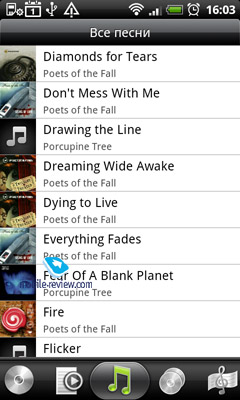 ![]() In addition to search, you can simply browse through the list. In that case, you will see the current letter at the top of the screen. Sense has a bug there, though. The thing is that if your current device language uses some non-Latin alphabet then the letters will be displayed only for that portion of the list where the song titles are in that very language. There won't be any letters for the titles in Latin there. Everything is normal again if you switch back to English, though. Photo and VideoIn my opinion, it is not very wise of HTC to continue replacing the standard Android album with their proprietary solution in Sense. For example, there is some evidence that Samsung is going to keep the default album application in its future Android devices simply because it is handy and functional indeed. HTC's album comes from earlier versions of Sense and looks simpler and less impressive than the one in Android 2.1.