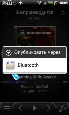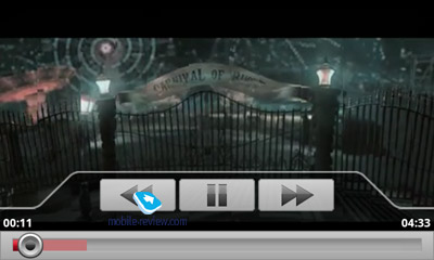 During the playback, the album picture, current and remaining track time, as well as its title and the artist's name are displayed (fullscreen mode). One can go back to the library or current playlist at any time. One can also look up the properties of the file, send it over Bluetooth or assign as a ringer tone. In the latter case, the track can be cut shorter.