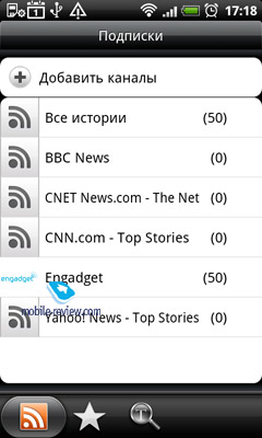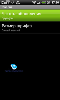 ![]() News. It is an application that collects news from various sources, technically, an RSS aggregator that can handle your favorite RSS feeds. It allows you to import those from a file, which can be easily generated by Google Reader, for example. Just open Google Reader and transfer all your feeds to a file and from it – to the program. In addition, HTC provides two custom widgets, for the fullscreen mode and a compact one.