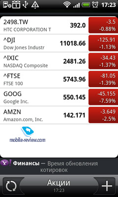 ![]() Stocks. Familiar to HTC WM device owners, this application allows you to follow stock and portfolio quotes of select companies. Hm, everything looks sad on the screenshot, dropping down.