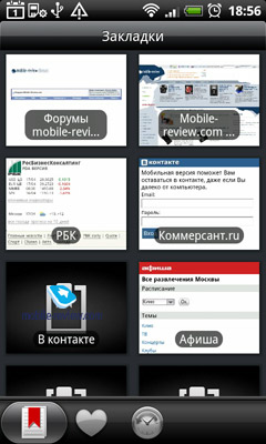 BookmarksThe browser allows you to store an unlimited number of bookmarks. To create one, it is enough to bring up the menu and choose the Create Bookmark option. When a bookmark is created, only its name and URL are stored. The bookmarks can be displayed in three different ways: the traditional list of saved pages, matrix of thumbnails, or "visual," which is eye-catching but not as convenient as the first two.