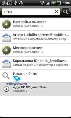 For the full format QWERTY keyboard, there is also a word auto-completing feature (similar to the one that has been used in Motorola phones for a while) that suggests various endings for the word you are typing at the moment. The vocabulary gets constantly updated with your input history, making the whole framework even more useful than the regular text input or T9 over time. ![]() Back to the table of contents >>> Global SearchThe topic has received hardly any attention in Android reviews (I admit that that is partially my fault, too), and therefore I would like to talk about the search options in this Sense review. As you know, Android has global search capabilities. All-in-all, the idea of a full-content search on a device is not novel and has also been available on Windows Mobile communicators and S60 for a long time. However, there it works in a very crude and clumsy way, whereas the Android implementation is much wiser. That is, Android 2.1 includes contacts, browser, applications (their names), music and YouTube in the global search, and HTC Sense has that list significantly expanded (twice as many options), which makes the feature even more useful.