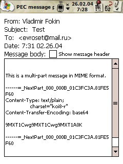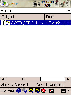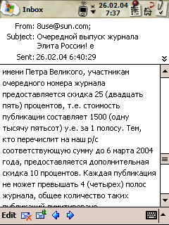 Почтовые программыЕсли программ для просмотра web-страниц для платформы Pocket PC достаточно, то с почтовыми программами дело обстоит плохо. На сегодняшний день существует четыре программы для работы с электронной почтой. О них и пойдет речь. Inbox (Входящие) – почтовая программа входящая в стандартный пакет поставки Pocket PC. Этот почтовый клиент умеет работать с несколькими учетными записями, нормально работает с русскими кодировками. Умеет удалять сообщения с сервера, для этого надо: удалить не нужные сообщения в папке «Inbox», они будут перенесены в папку «Deleted Items», удалить их оттуда и сделать синхронизацию, после чего происходит удаление этих сообщений с сервера. К минусам этой программы можно отнести: не очень удобный интерфейс, медленную работу, отсутствие поддержки HTML в сообщениях. WebIsMail 2 - первую версию протестировать не удалось, т.к. она работает только на PPC2002. На сайте разработчика есть информация, что можно скачать версию 1.02 якобы заточенную для PPC2002/WM2003, но это видимо рекламный ход, т.к. скачать можно только старую версию. Зато удалось протестировать бету-версию WebIsMail 2. Программа удобная, работает достаточно быстро, поддерживаются практически все кодировки. Без проблем работает с несколькими почтовыми ящиками. По заявлению разработчиков можно скачивать большие почтовые сообщения размером до 1.5 Мб. Будем ждать коммерческой версии программы, так как она может стать лучшем почтовым клиентом для Pocket PC. nPOP – еще один почтовый клиент. Он привлекателен простым интерфейсом и быстрой работой. Эта программа могла бы быть лучшей, если не одно но: она не умеет работать с KOI-8. Вернее умеет, но требует некоторых надстроек. Для того чтобы программа понимала другие кодировки, надо скачать нужный шрифт в папку windows/font на вашем КПК, и изменить файл npop.ini который находится в папке куда вы установили программу. Для работы с разными кодировками вам придется создать несколько ini файлов и менять их по мере необходимости. Pocket Email Checker – почтовая программа с минимальным количеством настроек, что является минусом этой программы. Не удобный интерфейс, не работает с KOI8. Умеет работать с несколькими учетными записями, может удалять сообщение с сервера. При инсталляции требует установки .NET Frameworks (15 Мб.) на настольный ПК. Как видите, ситуация с почтовыми программами не очень хорошая. Всего четыре программы, из которых с KOI8 нормально работают только две. Будем надеяться, что ситуация изменится, а пока придется работать с тем, что есть. Таблица. 2 Почтовые программы на Pocket PC
