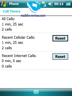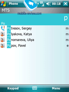 Contacts. The capabilities of the Contacts here are on a par with what you can squeeze out of the desktop version. In WM 6.0 the number of fields available when submitting contacts has remained the same – apart from a photo, you are free to assign a personal ring tone to a contact. In sum there are 37 fields (extra blanks äîïîëíèòåëüíûå ïîëÿ – IM, Company Tel, IM2, IM3, Manager, Govt. ID, Account, Customer ID), a text note (no handwriting or voice note anymore). The fields’ names are not the subjects to change, just like in the desktop edition, however you shouldn’t think of it as a drawback – 37 fields are more than enough, and in case it is not, you can always drop a few lines in the Text Note field. There are blanks for two home and two work numbers, yet only one cellular phone number can be submitted. Along with inability to alter names or number of these fields, you won’t be able to bind up a personal tune with a group, so that using a third-party application is required, for example Photo Contacts Pro. Search can be conducted in Company Directory, in case your colleague’s phone number is not on the Contacts list. No issues were detected with PC synchronization, including contacts in Russian.