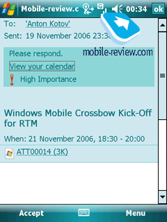 Messaging. The build-in mail client has always been one of the Windows Mobile weaknesses, but the state of affairs here is seemingly shifting for the better. The first significant step in this direction was undertaken in Windows Mobile 5.0 AKU 2.0 with the advent of support for Microsoft Direct Push. The greatest change in Windows Mobile 6.0 –HTML support for messages (previously – text only). But that’s about it.