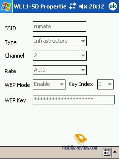 The receiving sensitivity is good. In a 3-room flat with an access point the signal was received everywhere, and the signal intensity wasn’t less than 35% (that’s more than enough for a Web-surfing and file downloads). The data transfer speed was limited to 1 MB ADSL channel, it’s even much for a handheld (though the card specifications tell about 11 Mbps, the maximum speed for 802.11b standard).