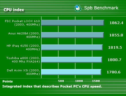 BatteryThe A620BT contains a non-replaceable Li-Ion battery (1300 mAh). At the moment due to the efficient power consumption system the handheld features the longest battery life. Asus claims 19 hours of off-line work. Our tests revealed 15 hours 40 minutes in the mp3 mode on a single charge (files read from the memory card, the screen off, processor in the Power Saving mode)! 17 hours sharp it took to read books with the minimum backlight and without the memory card involved. At the maximum load the A620 lasted 3 hours 40 minutes (full screen brightness, 400 MHz frequency rate, video mode, Bluetooth on). At low screen brightness and Bluetooth off the handheld was good for 4-5 hours playing games (a record figure!). I can’t recall a handheld with the color screen showing higher performance (I mean standard batteries). ProductivityThe A620BT contains standard 64MB of SDRAM, but only 55 MB of it are usable for programs and data. The integrated nonvolatile memory amounts to 35 MB and is used to back up files and run small applications. The handheld is powered by the Intel XScale PXA255 400 MHz processor. During tests it proved one of the fastest just slightly yielding to FS Pocket LOOX 610 (or Asus A 716), sometimes even outpacing it. We used the SPB Benchmark package to test the productivity. For this purpose we’ve chosen highly productive models and set the Asus A620 processor in the Advance Performance Enhancement mode.