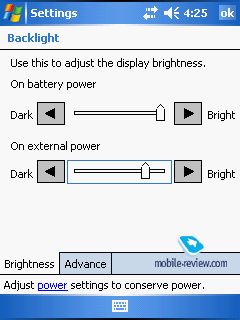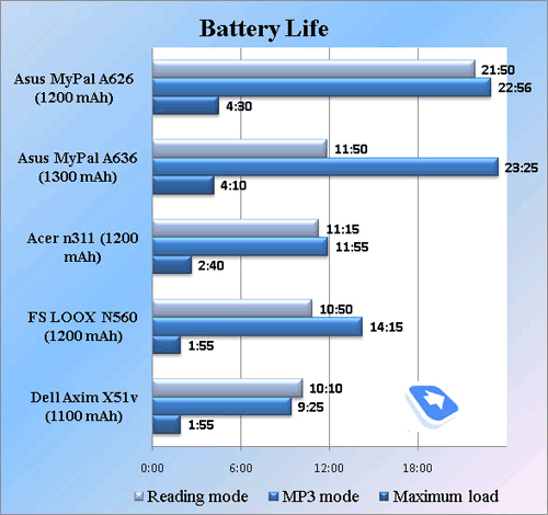 The vertical viewing angles are superb – the image doesn’t get distorted at all. But the horizontal ones let the A626 down when you incline the PDA. Partly, the reason is the matte coating; in the sun the display gets heavily washed out, yet remains readable. Generally speaking, the screen is comfortable to use, but lags behinds the competition in terms of picture quality, beating them with the brightness level. Nevertheless why would they throw QVGA in it, is quite obscure since even communicators are now getting VGA resolution. Battery lifeThe handheld carries a 1200 mAh Lo-Ion battery onboard, which is par for the course for many PDA by various manufacturers. Though, it is quite another matter that in many models capacity like that allows getting only moderate or even sub-standard figures of battery life. As the manufacturer claims, in the A626 this capacity will be enough for 15 hours of music playback with the screen switched off. Below are the results of our standard battery life tests. Reading mode – the least power-hungry mode of all. Display backlighting level is set to the minimum that makes for comfortable reading, then we launch Haali Reader and activate auto-scrolling. MP3 mode – self-explanatory test. Display backlighting gets switched off (in case with the P3400 it was set to the floor), volume level is set to the medium level, and then we link up the PDA with headphones and playback MP3-files with 128 Kbit/s bitrate via MortPlayer. Maximum load - display brightness is set to maximum, thereupon with start up TCPMP player and initiate playback of 320x240 pixel movies.