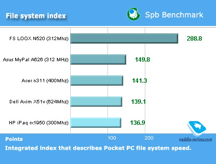 We carried out a standard test with SPB Benchmark pack. In view of the fact, that the test does not give an objective picture of the performance of handhelds running WM 5.0, we have extracted only a few types of data from it. In terms of performance, the A626 is among the best in our chart.