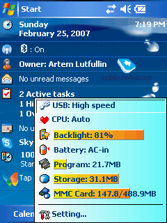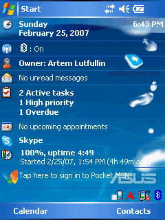 ASUS Status is a module used for displaying system status thumbnails on Today screen. In minimized state it is the A icon you see, tapping on it will bring up a window in the lower right corner, featuring system information: USB connection type, CPU work mode, backlighting level, memory volume and battery charge. Any of these items can be removed from the list if your wish.