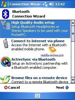 In the read mode (auto scrolling in Haali Reader, the lowest backlight level and the lowest clock rate) the A636 lasted for 35 hours 50 minutes on a single charge. The MP3 playback from the memory card with the screen of drained the device completely out within 23 hours 24 minutes. Under the maximum load Asus A636 worked for 4 hours 10 minutes. In GPS navigation mode with 50% backlight level the device was good for 7 hours 10 minutes. Bravo Asus! Hats off! The PDA outpaced all previous records. And don't forget that the A636 is equipped with Intel XScale processor and not the efficient TI, and the battery capacity is far from 3600 mAh. We suppose, this record will be kept for a long time, this model should become the standard to access offline work. Other manufacturers should think about power consumption optimization for Intel XScale processor. InterfacesAs for Bluetooth and Wi-Fi in the A636, we won't go into details, as both modules work without reprimands. There are Broadcom drivers of latest version for Bluetooth, the fact says much about their complete functionality.