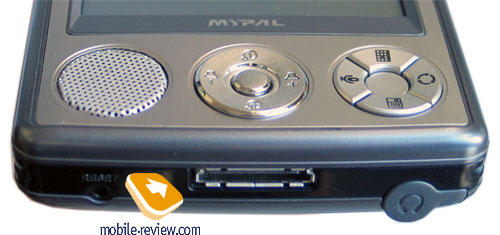 At the top end we see Power button, a silo for the big and comfortable plastic stylus pen, a SD/MMC slot supporting SDIO. At the bottom are a synchronization connector (like in Asus A730, FS LOOX 710/720), a rest button, a standard audio jack protected with a rubber gag. However I can't follow the logic, why the audio jack is protected and the synchronization connector is open. Music playback quality is standard high, I have no claims to it.