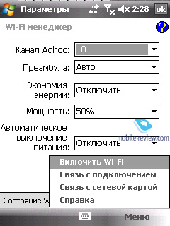 ![]() При подключении кабеля можно выбрать несколько режимов, среди них есть режим чтения карт – mass storage (card reader) и два режима ActiveSync (быстрый и нормальный). ![]() Wi-Fi (802.11 b/g). Мы тестировали этот интерфейс при помощи домашней точки доступа, выходя в Интернет с помощью устройства и Wi-Fi-соединения, а также совершая звонки в сети Skype. Никаких нареканий к Wi-Fi не возникло. Отдельно отметим наличие в комплекте программ утилиты для настройки этого интерфейса. Можно самостоятельно задать мощность сигнала, а также включить режим экономии энергии.