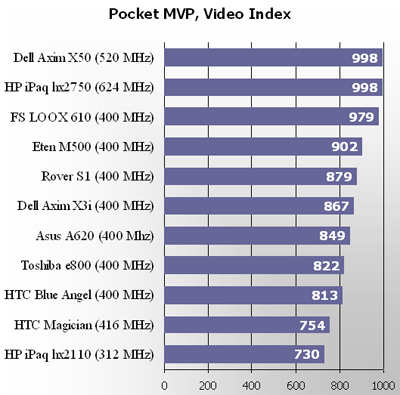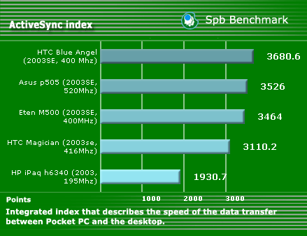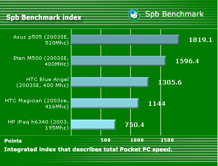 This index describes Pocket PC's CPU speed. At a lower clock rate E-Ten M500 is slightly ahead of HTC Magician.