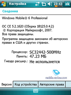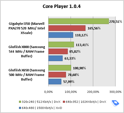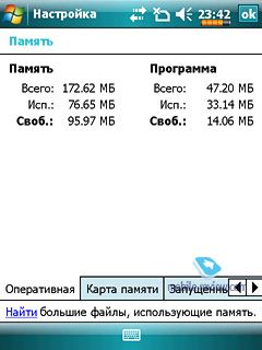Никаких проблем в работе Bluetooth-модуля обнаружено не было. C беспроводной стереогарнитурой модель работает также без нареканий. Качество звука, субъективно, приемлемое, хотя звучание слишком плоское и невыразительное, но посторонних шумов или помех нет. Если отключить гарнитуру, звук автоматически переключится на динамик коммуникатора в течение 15-20 секунд. Wi-Fi версии 802.11b/g. Проблем в работе Wi-Fi обнаружено не было, соединение стабильное (прошивка 257), не разрывается. Аппарат умеренно нагревается при включенном модуле Wi-Fi. При тестировании связки Wi-Fi-подключения и Skype с последним возникли привычные для моделей E-Ten проблемы. Программа упорно вылетала при любой попытке совершить голосовой вызов, хотя в режиме чата все работает корректно. Причина проблемы в несовместимости новых версий Skype с аппаратами E-Ten. Решение – установка старой версии программы. ПроизводительностьКоммуникатор построен на платформе Samsung SC32442, которая используется во всех новых моделях компании: Glofiish X500, X500+, X600, X800. Отличие от некоторых аппаратов заключается в том, что для X650, как и для X800, частоту центрального процессора повысили до 500 МГц против стандартных 400 МГц для остальных моделей. При этом сам процессор остался абсолютно тем же (архитектура ARM9). Повышение частоты в теории должно ускорить работу устройства, сделать интерфейс более быстрым, ведь для модели с VGA-экраном вопрос быстродействия в стандартных приложениях критичен. На практике картина не сильно изменилась в сравнении с моделями, работающими на 400 МГц. ![]() Объем доступной для работы операционной системы оперативной памяти равен 47 Мб (из 64 Мб). Из этого объема около 25 Мб занято сервисными процессами для работы ОС, для запуска программ остается примерно 20 Мб. Подобного объема хватает для запуска 2-3 «тяжелых» приложений, например, связки Навител Навигатор 3.0 (~ 6-7 Мб), mChat (~ 5-6 Мб) и какого-то простого приложения. Количество flash-памяти составляет 256 Мб, из которых пользователю доступно примерно 172 Мб (в зависимости от прошивки). При этом после первого запуска около 20 Мб flash-памяти отнимают программы первой установки (дополнительное ПО от E-Ten), так что для использования остаются примерно 150 Мб. Заметим, что никто не мешает вам сразу после запуска удалить все дополнительные приложения или те, которые вы не используете, и освободить 20-25 Мб памяти. ![]() Теперь проведем тестирование скорости работы процессора нашим стандартным способом – в проигрывателе Core Player. Это наиболее приближенный к реальности тест. Напомним, что результат, равный 100%, говорит о том, что видео в указанном разрешении и качестве будет проигрываться на устройстве без заметных «притормаживаний», выпадение кадров возможно лишь в динамичных сценах. Значение выше 120-130% означает, что мощности аппарата хватит для безупречного (без зависаний и выпадения кадров) проигрывания видео указанного разрешения и качества. ![]() По скорости обработки видео X650 находится на уровне Glofiish X500+ или даже чуть ниже. То есть увеличение частоты процессора не дало никакого результата для скорости работы с видео. Glofiish X650 проигрывает своему основному конкуренту – построенному на платформе от Marvell Gigabyte i350. Тест самого тяжелого ролика (640x480 точек) показал результат в районе 55%, это ожидаемый показатель для Glofiish. Но вот показатель 100% для неконвертированного видео выглядит низким. Да