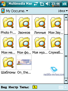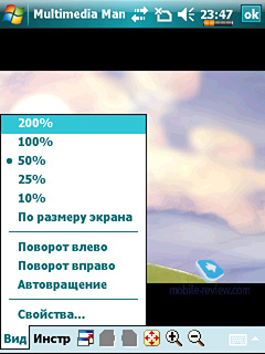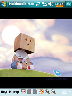 ![]() Это в меру красивая и приятная (хотя и слишком пестрая) оболочка для быстрого доступа к программам, настройкам. Внутри оболочки приложения разделены по вкладкам: Phone, PDA, Fun, System. В любую вкладку вы можете добавлять любое количество программ или удалять их. Иконки программ, а также вкладки, сделаны большими по размеру, что позволяет работать с программой без использования пера. Запускать программы можно с помощью пальца. Multimedia Manager – утилита для просмотра изображений. От стандартной программы «фото и видео» отличается возможностью удобного пролистывания изображений, полноэкранным просмотром (не только в режиме слайд-шоу), а также возможностью передачи просматриваемого изображения в одну из программ для дальнейшего редактирования или отправки в MMS.