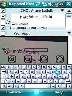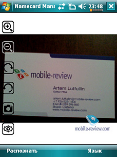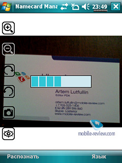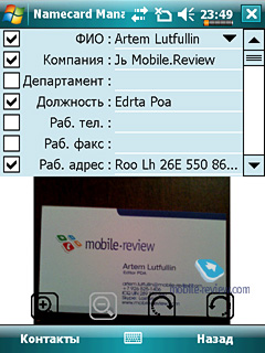 Namecard Manager – приложение для распознавания данных с визиток. Теоретически программа должна распознавать информацию, полученную со снимка визитной карточки в режиме макросъемки. На практике, для того чтобы добиться успешного распознавания, иногда приходится сделать снимок визитной карточки до 3-4 раз. Проблема заключается в не самом высоком качестве фотографий и в плохом алгоритме распознавания, нередко вместо кириллических символов программа вставляет латиницу или попросту пропускает буквы в именах и названиях.