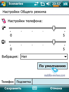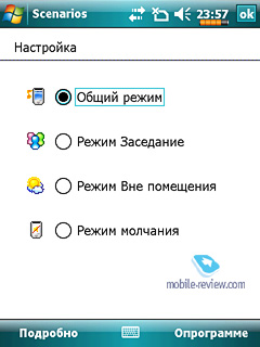 Speed Dial – удобная надстройка для контактов, отображает последние набранные 10 номеров, включая имена и телефоны. Удобно просто нажать пальцем на большую виртуальную кнопку с контактом, при этом набирается указанный на ней номер. При необходимости быстрого набора или набора на ходу программа просто незаменима. ![]() Scenarios – при помощи этой утилиты можно настроить профили. Всего доступно четыре профиля. Для каждого можно настроить громкость звонка, силу вибрации, а также уровень экранной подсветки. Как уже говорилось выше, для быстрого доступа к профилям значок программы можно вывести на экран «Сегодня», в нижнюю часть.