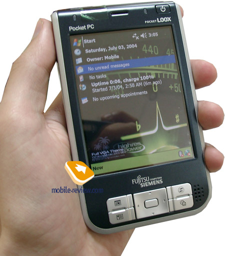 FSC Speed Menu. It’s an analog of Start button, but it is much flexible and advanced, that is nice – you can easily adjust it for your own needs by adding necessary applications and folders. ConclusionFS Pocket LOOX 720 will be offered for sale these days. In Russia it will also appear very soon. The price will make up $675. Compare it $650 for HP iPaq hx4700 and $600 for Asus A730W. The LOOX 720 seems to be the most expensive from the new Pocket PCs. As a result of a tough competition the price for the Pocket LOOX 720 might fall to $600 or lower by the end of the year. Given the fact that Dell Axim X50 is made by the same company HTC (not by Wistron as the Axim X5), Dell will hardly knock down prices for Pocket PC. But we won’t make any hasty conclusions. The handheld has ultimate features: two slots for expansion, two wireless adapters, USB-host, large RAM, VGA-screen, long battery life. The processor performs well during tests and under real conditions. The LOOX 720 comes with a nice design and a well thought-out ergonomics (grooves at sides, the scrolling wheel), unless the buttons have a lag. The microphone quality is the highest. The screen isn’t a large one, but its quality makes it the best compared with Toshiba e800 and Asus A730 (consider viewing angles). I am not praising the device, I’m just enumerating the facts. To say the truth, it’s very hard to find faults with the LOOX 720. Its only weak point is the price, besides the fans of Toshiba e800 and HP iPaq 4700 might say, the comfortable work with the VGA screen is possible only at 4”. The LOOX 720 represents a Hi-End PDA of the second half 2004. Two wireless adapters, VGA-screen, Intel XScale PXA27x processor, WM2003SE operating system – we’ll meet such a combination many times in our future reviews very soon. I wonder who will be the first to release a handheld with the VGA screen and a single slot for expansion… Description: