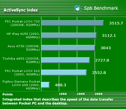 The “old” sped-up Toshiba e800 is leading with the CPU index, that can be related to a higher frequency rate and the speed-up specifics. The LOOX and Asus are slightly behind. I think we should comment on the following point. Here and farther in the tests Asus A730 performs worse than the LOOX taking into account the fact that the hardware in both models is almost the same. With our test results we applied to the head office of Asus and received an official affirmation that under the final version of the software Asus A730 would work “to 3 times faster”. So let’s wait and see, I’d take the model for the tests for the third time, this time from the retail. Naturally we tell our readers about the new results, and as for now, let’s return to our review.