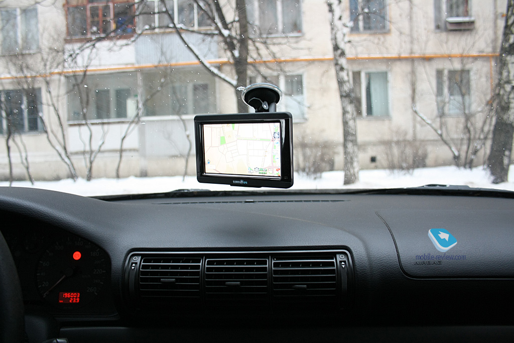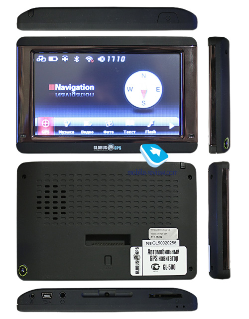 ПозиционированиеЗдесь все как обычно просто: перед нами универсальный навигатор средней ценовой категории с относительно большим экраном. Автомобильный, потому что габариты устройства исключают его использование в пешеходных прогулках. В GlobusGPS GL-500 есть некоторые дополнительные функции, есть минусы и плюсы, обо всем по порядку. ![]() Дизайн, габаритыВнешний вид навигатора можно охарактеризовать одним словом – неприметный. Корпус черного цвета из матового, напоминающего на ощупь бархат, пластика. По периметру экрана вставка из пластика под хромированную поверхность, на мой взгляд, она здесь лишняя. Эта часть корпуса постоянно пачкается, к тому же на солнце по ней отлично бегают солнечные зайчики, в поездке это может быть совсем некстати. ![]() Навигатор массивный и тяжелый, габариты модели: 140x89x170 мм, вес: 180 грамм. В комплекте с аппаратом идет недорогой чехол из кожзаменителя, в котором есть окно для экрана. То есть можно вложить навигатор в чехол и работать с ним. А еще чехол можно повесить на ремень. Обе ситуации маловозможны в жизни, для пеших прогулок навигатор неудобен из-за габаритов. Но если кому-то все-таки нужен чехол, он здесь есть. ![]() ![]() Элементы управленияНа верхнем торце справа расположена кнопка выключения навигатора, слева – пенал для стилуса. Перо очень маленькое, пользоваться им не слишком удобно, однако едва ли оно вам понадобится, с навигатором можно без проблем управляться нажатиями пальца. ![]() ![]() ![]() На лицевой стороне, справа от дисплея, находится световой индикатор. Он горит красным во время зарядки, слева от экрана находится датчик света. ![]() На ребрах никаких элементов нет, а на нижнем торце расположены: разъем для карты памяти формата SD/MMC (c поддержкой SDHC), разъем miniUSB для подключения к ПК, фирменный разъем для зарядки навигатора, 3.5 мм для наушников и разъем для подключения внешней GPS-антенны. ![]() На задней стороне корпуса, слева сверху, располагается динамик, а по центру углубление для крепления в держателе. ![]() Использование в автомобиле, автомобильное креплениеАвтомобильный держатель в GlobusGPS GL-500 – это нечто среднее между массивными креплениями, используемыми, например, в навигаторах Texet и компактными и удобными держателями TomTom и Mio. От Texet здесь размеры крепления, оно большое, однако при этом изменять положение навигатора в уже закрепленном виде удобно. В первую очередь за счет того, что для изменения его положения нужно ослабить всего один винт на держателе и после этого можно вращать крепление с навигатором в любой плоскости. Аналогичная схема используется в держателях TomTom, например. ![]() ![]() ![]() Извлекать навигатор из крепления в целом удобно, хотя возможны ситуации, когда при попытке снять его и сам держатель будет отсоединяться от стекла. Для того чтобы вынуть навигатор из крепления нужно нажать кнопку на держателе и потянуть навигатор вверх и на себя с небольшим усилием. ![]() ![]() ЭкранВ навигаторе установлен TFT-дисплей с разрешением 480x272 точки. Диагональ экрана составляет 5” (112x64 мм). У экрана хорошие углы обзора по горизонтали и заметно хуже по вертикали (искажения при малейшем наклоне навигатора экраном от себя). Дисплей с матовым покрытием, за счет которого он не так сильно слепнет на солнце. Минус – ощущается некоторая бледность картинки, нехватка сочности цветов. В настройках экрана можно включить фу