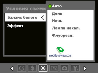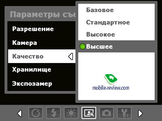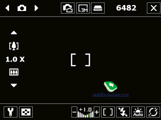 В нижней части видоискателя слева расположены иконки входа в меню настроек камеры или перехода к галерее. Правее находятся символы изменения яркости, способа замера экспозиции, активности вспышки и баланса белого. Слева мы видим довольно своеобразно выполненное меню зуммирования снимка. Для приближения и отдаления объекта съемки нужно нажать на соответствующую стрелку (вверх или вниз) или просто выбрать значок зуммирования. Максимальное, 8-кратное, увеличение доступно при съемке в минимальном (160x120) разрешении. В разрешении 640x480 пикселей максимальное увеличение уменьшается до 4-кратного. С 1 мегапикселя и выше зум недоступен. С видео ситуация почти аналогичная. В низком разрешении видеозаписи (128x96 и 176x144) доступен 2-кратный зум. Во время записи произвести увеличение нельзя, как и воспользоваться какой-либо другой настройкой. Поговорим более детально об упомянутых настройках камеры (названия элементов и меню указаны для локальной версии коммуникатора). Для фото доступны следующие разрешения: