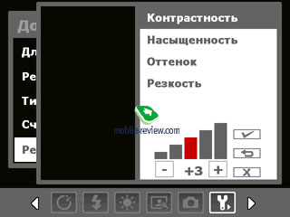 За изменение качества изображения отвечают еще несколько параметров. Это регулировка контрастности, насыщенности, оттенка и резкости по 5-балльной шкале. Дополнительно настраивается звук срабатывания затвора, сетка в режиме видоискателя на экране, таймер, штамп времени на фото.