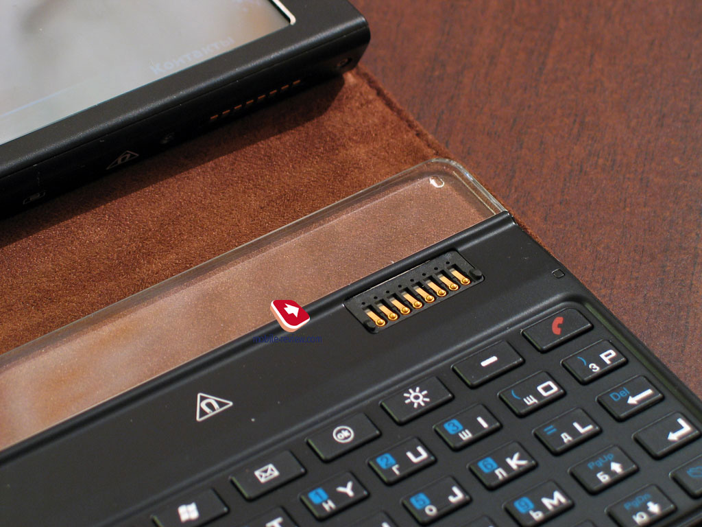 Карта памяти вставляется в обыкновенный паз, для того чтобы ее вынуть, достаточно просто потянуть карту. Аккумулятор также вставляется в паз, но при этом имеет специальное крепление. На самом аккумуляторе есть небольшой блок с выдвижной частью – тонкой иглой. Когда батарея полностью входит в отсек, эта игла опускается в паз, тем самым закрепляя аккумулятор. Крепление SIM-карты наиболее нестандартное. Карта входит в паз, закрытый небольшой крышкой из белого пластика. Чтобы вставить или вынуть SIM-карту, необходимо вначале приподнять крышку, после чего вставить карту в паз. Для вынимания проделывается та же операция, но при этом карта поддевается ногтем. В итоге процесс установки SIM-карты превращается в увлекательное и трудоемкое занятие. Медные контакты, расположенные рядом с отсеком для аккумулятора, карты памяти и SIM-карты, служат для подключения клавиатуры. В центре нижнего торца нанесен предупреждающий символ в виде подковы. Приведем дословно пункт из инструкции к аппарату, предупреждающий о наличии магнита: