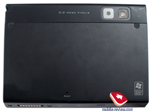 Обратимся к задней панели коммуникатора. Здесь находится глазок основной 3 Мп камеры, светодиодная вспышка, а также клавиша мягкой перезагрузки и два разъема. Разъемы расположены по краям верхней части панели и прикрытии резиновыми заглушками-пробками. Один из них служит для подключения внешней антенны, другой – для подключения внешней антенны GPS. О возможностях камеры мы поговорим во второй части обзора.