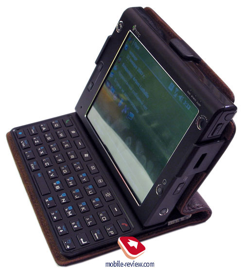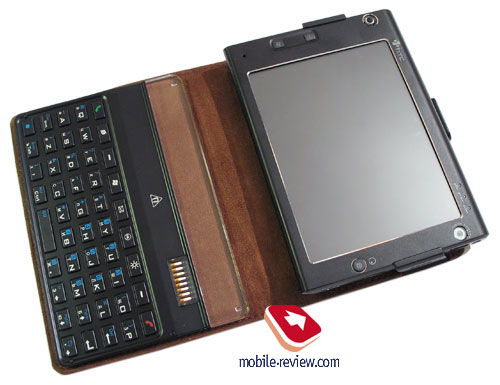 В итоге мы получаем в закрытом виде моноблок в кожаном чехле. Конечно, размеры устройства при этом увеличиваются. В закрытом состоянии панель клавиатуры закрывает экран коммуникатора. Когда мы раскрываем конструкцию, корпус устройства закрепляется на магнитной части клавиатуры, тем самым придавая всему аппарату знакомый вид: клавиатура расположена горизонтально, а корпус – под наклоном.