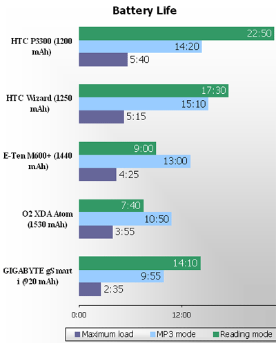 Judging by the results displayed in course of out routine tests, valuing lifetime, model P3300 performs more or less on the same level with HTC Prophet/HTC Wizard. In e-book mode (minimal backlighting level, auto-scrolling in Haali Reader) the communicator lasted almost 23 hours, which is considerably better than HTC Wizard owing to low display’s energy consumption at dim backlighting. In music mode (playback of MP3-files with the bitrate of 128 Kbit/s stored on memory card, with deactivated display), the battery went low after 14 hours and 20 minutes. When it was given a real challenge (playback of video stored on memory card, maximized backlighting level), the P3300 managed to stay active for 5 hours and 40 minutes.