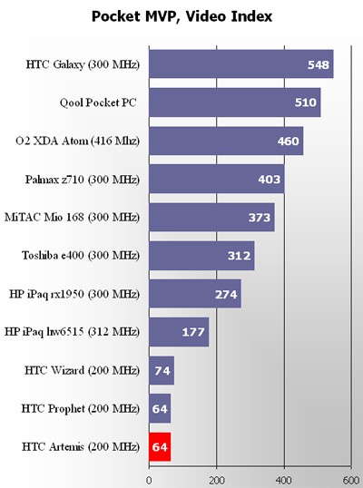 Synchronization is quite speedy (doesn’t affect the total score). We don’t publish the total score here, as it is greatly distorted for Windows Mobile 5.0. We tested out video with The Core Pocket Media Player (former BetaPlayer), the results are as follows. The performance depends mostly on the graphics accelerators and Wireless MMX set, embedded in the latest Intel XScale CPU. 100% performance means the smooth film rendering without dropped frames, but with possible collapses during active scenes.