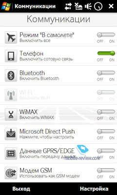 ![]() Результаты тестов несколько неожиданные, особенно часть с чтением книги. Этот тест я прогонял несколько раз, в том числе с отключенной подсветкой (результат в графике) и с подсветкой на минимальном уровне (результат – 8:06). Объяснить столь малое время работы в режиме чтения пока нечем, аналогичный по большинству характеристик Touch HD работает в этом в два раза дольше. Данные по другим режимам ожидаемые и находятся примерно на уровне HTC Touch HD. ПроизводительностьУстройство построено на платформе Qualcomm MSM 7206A. Отличия от MSM7201A минимальные, и на общей производительности они никак не сказываются, что подтверждают и тесты. ![]() Центральный процессор имеет частоту 528 МГц. Коммуникатор обладает 288 МБ оперативной памяти, из которых для работы ОС и приложений доступно около 190-200 МБ. С учетом памяти, занятой разнообразными системными файлами и оболочкой TouchFLO 3D, для пользователя свободными остаются еще примерно 90-100 МБ. ![]() При таком объеме свободной оперативной памяти можно забыть о количестве запущенных в фоне приложений. Для загрузки пользовательских данных можно использовать постоянную память (ROM), ее около 80 МБ, или «внутреннюю память», это примерно 8 ГБ. Этого объема хватит почти для всех ситуаций, в том числе для хранения видео и музыки. ![]() Как и HTC Touch HD, новый коммуникатор компании не способен воспроизводить неконвертированное видео. Общая скорость работы интерфейса выше, чем в Touch Diamond, но не слишком, это можно заметить зрительно, если взять оба аппарата в руки, иначе скорее всего нет. Чтобы смотреть на HTC MAX 4G видео, следует один раз потратить время и выработать для себя оптимальный алгоритм его конвертирования. ИнтерфейсыАппарат работает в сетях GSM (900/1800/1900) и Mobile WiMAX (2,5-2,7 ГГц). Поддерживается стандарт высокоскоростной передачи данных – EDGE, хотя в этом аппарате он не так интересен, как ранее, благодаря наличию поддержки WiMAX. При подключении к WiMAX скорость может варьироваться в широких пределах, однако в среднем это диапазон от 1,5 до 7-8 Мбит/c, именно значения из этого диапазона мы видели чаще всего во время тестирования HTC MAX 4G. Для синхронизации с ПК и передачи данных используется комплектный кабель miniUSB. Интерфейс USB - 2.0. Теоретическая скорость передачи данных достигает 480 Мбит/сек. При выборе режима ActiveSync загрузка 10 Мб файла в память устройства через USB-подключение занимает 6-9 секунд. Если выбрать специальный режим «Дисковод», скорость загрузки данных увеличивается в 3 раза, до 2 800 Кб/сек, и составляет 3-4 секунды для 10 Мб файла. В этом режиме доступна память карты памяти, она распознается компьютером как съемный диск, но устройство нельзя синхронизировать с ПК. Для работы с беспроводными интерфейсами в HTC MAX 4G установлена программа из набора HTC – Comm Manager. ![]() Одна из неприятных особенностей модели - невозможность одновременной работы модуля WiMAX с Bluetooth или Wi-Fi. Впрочем, в компании обещают в ближайшее время выпустить новую прошивку для MAX 4G, которая устранит этот недостаток, сейчас уже есть тестовая версия этой прошивки, так что ждать осталось недолго. ![]() Встроенный модуль Bluetooth 2.0+EDR. Драйвера от Microsoft, как и в большинстве других устройств HTC. Рассмотрим поддерживаемые устройством профили и их назначение.