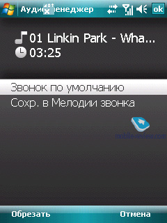 ![]() Audio Manager – application similar to the standard Media Player. In terms of the abilities this app doesn’t differ from the built in player, saving for the interface. However the HTC’s own application packs tools for basic track editing, like cutting fragments so as to set them as ring tones afterwards. Now this operation is performed really easily, even a newcomer won’t have any problems with doing that – you pick a track, specify the fragment you need (in seconds or on the progress bar). For example, you can select a 6-minute long song and get take 30 seconds out of it by cutting off 2 minutes from the beginning and 3,5 minutes before the end.