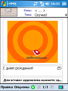MMS. There is no built-in client for multimedia messages in the operating system, the developers have to use programs by exterior developers. In our case we have MMS Composer by ArcSoft (the version - 3.0.7.11). When you compose an MMS, the interface is vivid, intuitive and clear. You won't face difficulties with MMS.