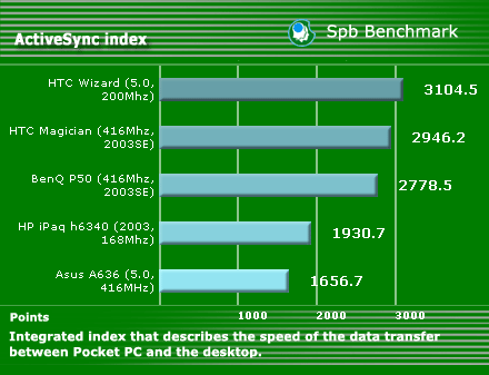 This index describes Pocket PC's CPU speed. We can hardly expect unprecedented results from a 200 MHz processor, though the results proved good.