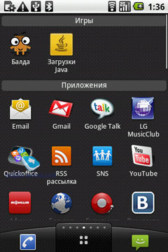 В компании думают об обновлении до Android 2.1 для Optimus в ближайшие месяцы. На мой взгляд, недорогим «роботам» вроде LG Optimus такие обновления не особенно нужны. В версии 1.6 есть пара самых важных изменений в сравнении с 1.5 (переделанный Маркет, поддержка нормальной работы с Bluetooth), и этого достаточно, чтобы не ощущать сильной потребности в обновлении. Ведь речь идет о недорогом устройстве, а не о флагмане, в котором хочется постоянно иметь все самое лучшее и свежее. Фирменная оболочка от LG – это переделанный рабочий стол из трех, пяти или семи виртуальных экранов на выбор, множество дополнительных виджетов и измененное окно со всеми программами.