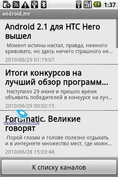 Холодный старт GPS в LG Optimus в моем случае занял около двух минут, в дальнейшем спутники находились не более, чем за 25-30 секунд. ЗвукЕсли бы не моя совесть, то я бы не стал ставить этот пункт в обзоры, но надо. Итак, звук в LG Optimus: на мой неизбалованный слух звучит Optimus ничуть не хуже и не лучше, чем все модели от HTC, начиная с Hero и заканчивая Desire. FM-радиоВ аппарате есть FM-радио. При первом запуске программы проводится автоматическое сканирование частот, затем создается список найденных радиостанций. Также новые станции можно добавлять вручную. Шесть станций можно «повесить» на быстрые клавиши в программе радио.