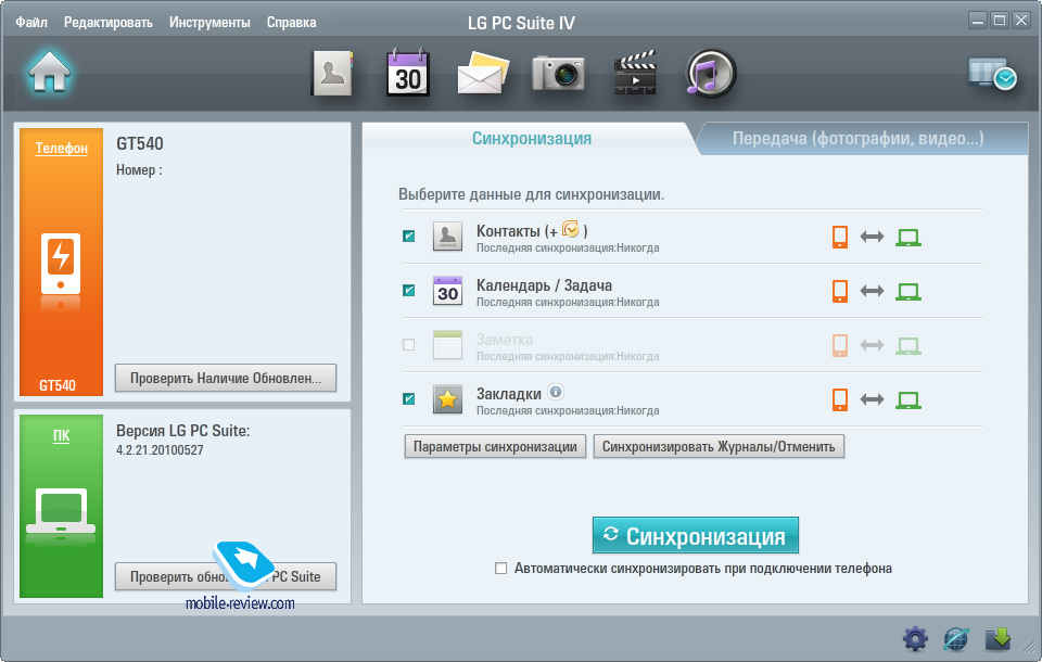 Для синхронизации с ПК и передачи данных используется комплектный кабель microUSB. Интерфейс USB 2.0. Копирование 10 МБ файла на карту памяти в режиме «Дисковод» занимает менее двух секунд. Во время соединения смартфона с компьютером можно выбрать режим съемного диска, в котором видна память карты памяти, или же режим синхронизации смартфона с программой LG PC Suite. В режиме связи с программой можно провести синхронизацию контактов с MS Outlook, календаря, сообщений, а также передать с телефона или на телефон новую музыку и картинки (фотографии). Приложение LG PC Sync оказалось на удивление «не глючным» (сравниваю со своим опытом использования программ от Samsung и Nokia) и красивым. Встроенный модуль Bluetooth 2.1+EDR. Поддерживаются следующие профили: