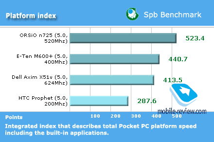 To test the device’s performance, we used SPB Benchmark kit – for reference we looked at results of similar models and PDAs manufactured by Dell.