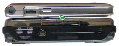 The left thumb comfortably rests on the wheel placed at the left side of the PDA. There is no wheel push function, for this purpose there are "OK" and "Cancel" buttons located nearby. Here we also see a miniUSB connector. At the opposite end is the connector for charging. The right side carries Power button and SD/MMC slot. At the bottom we find an infrared port. There are a headphones jack, a СА slot and a silo on the top. The back panel hides a battery compartment and a speaker of average sound volume.
