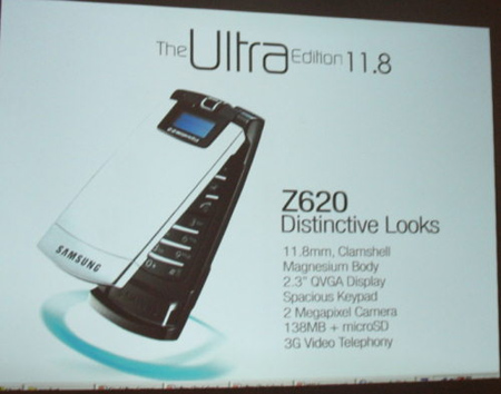 The Ultra Edition 11.8 (Z620) is the slimmest clamshell in the world, as Samsung claims. It is equipped with a 2MP rotary camera with x3 digital zoom and a 2.3" internal TFT screen with the resolution of 240x320 pixels and a smal OLED display.