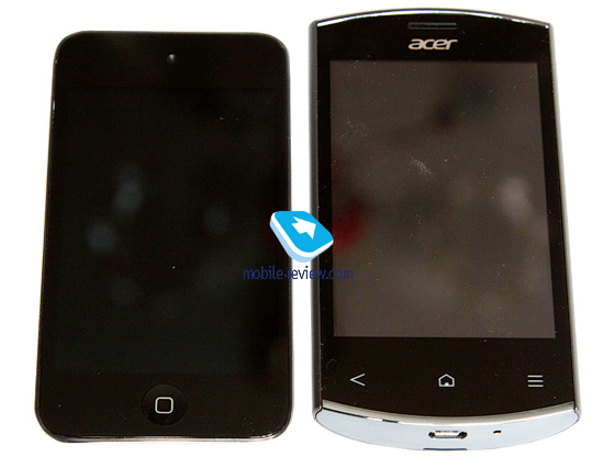 Смартфон удобно носить как в кармане брюк, так и в нагрудном кармане. В сравнении с Galaxy S2 и iPod Touch 4G: ![]() ![]() ![]() Элементы управленияПод экраном находится сенсорный блок управления. На нем находятся всего три кнопки: «Назад», «Домик» и «Меню». В Acer решили отказаться от кнопки «Поиск». К сожалению, каждый производитель сам решает, в какой последовательности расположить кнопки, поэтому если вы перешли на Liquid Express со смартфона HTC, то вам потребуется немного времени, чтобы привыкнуть к другому расположению кнопок. Отказ от кнопки «Поиск», с одной стороны, оправдан, т.к. ею не очень часто пользуются, однако иногда ее не хватает. ![]() На нижнем торце находятся разъем microUSB и отверстие микрофона. ![]() На верхнем торце справа располагается кнопка включения, слева - разъем 3,5 мм для наушников. ![]() На правом боку смартфона находятся разделенные кнопки громкости. Пользоваться ими удобно. ![]() Сзади находятся глазок камеры и динамик. Громкость динамика - это отдельный плюс Liquid Express, аппарат звучит заметно громче, чем большинство Android-смартфонов. Слот для карты памяти находится под крышкой, поддерживается «горячая замена», однако чтобы сменить SIM-карту, нужно вытащить аккумулятор. Аппарат поддерживает microSDHC карты объемом до 32 ГБ. ![]() ЭкранДиагональ дисплея — 3,5 дюйма, разрешение 480х320.точек (HVGA). В аппарате используется обычный TFT-экран, у него неплохой запас яркости и углы обзора, однако при такой диагонали желательно иметь WVGA-разрешение. Покрытие экрана — пластик, он царапается, экран маркий, стереть отпечатки немного тяжелее, чем на дисплеях, использующих в качестве покрытия стекло. ![]() КамераВ смартфоне установлена 5 МП камера с фиксированным фокусом. Интерфейс камеры максимально прост: в режиме видоискателя на экране слева отображаются режимы работы камеры (фото, видео), справа сверху - доступное количество снимков, а внизу - полоска масштабирования. Дополнительные параметры выбираются при вызове специального меню: разрешение, баланс белого, а для настройки некоторых пунктов нужно открыть окно «Параметры». ![]() ![]() Для фото доступны следующие разрешения: